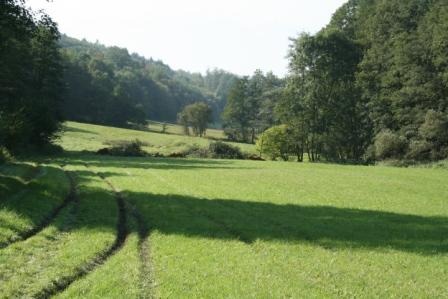 Bachaue mit Großseggenriedern, Mädesüßfluren, Feuchtwiesenresten, aufgegebenen Fischteichen, naturnahen Waldsäumen und kleinen Bereichen wassergeprägten Laubwaldes.