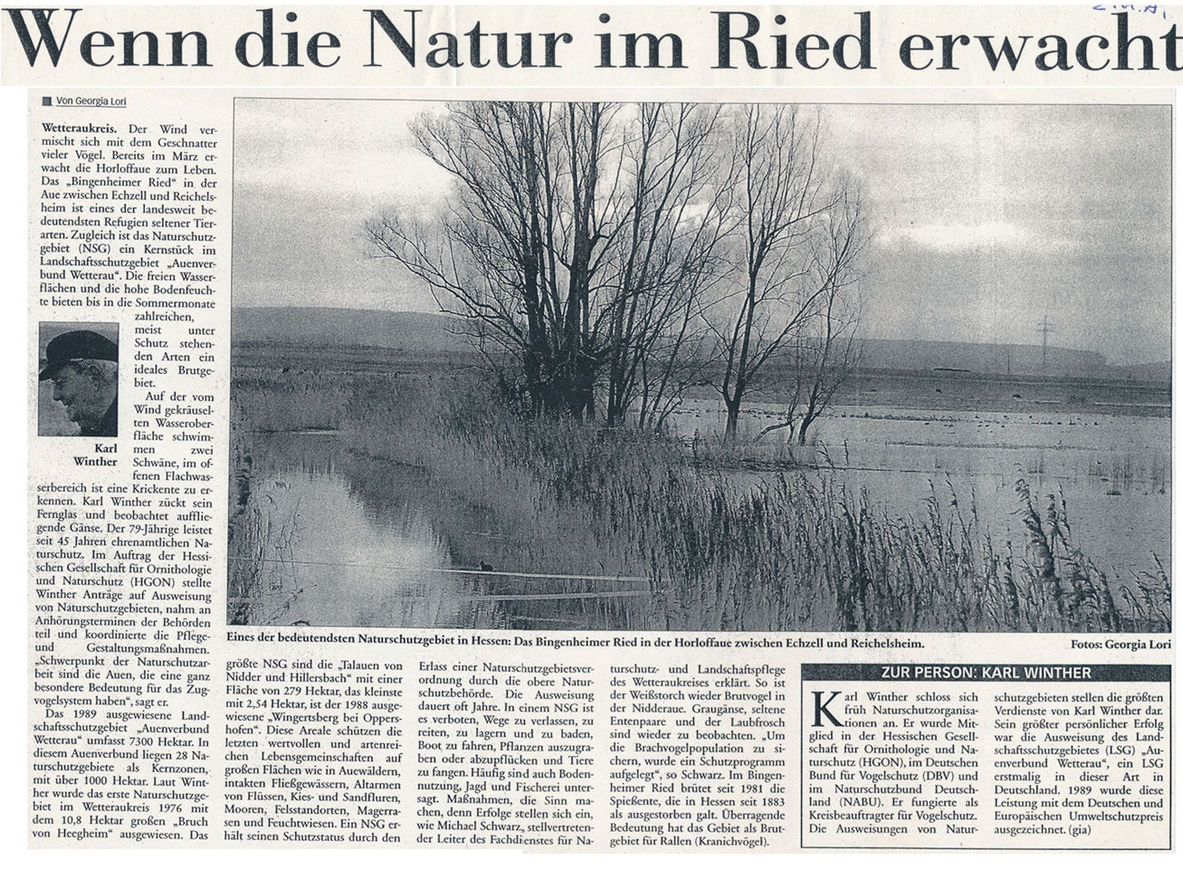 Hintergrundinformationen zum Naturschutzgebiet „Bingenheimer Ried“: Fakten 1985 Ausweisung als Naturschutzgebiet „Bingenheimer Ried“, Fläche rd. 85 Hektar. Das NSG liegt in der Horloffaue und bildet das Herzstück des Landschaftsschutzgebietes „Auenverbund Wetterau“. Zudem ist es, vor allem wegen seiner Bedeutung für den Erhalt seltener Vogelarten, Teil des europäischen Schutzgebietsnetzes NATURA 2000. Der überwiegende Teil der Flächen gehört zur Gemeinde Echzell, ein kleiner Teil zur Stadt Reichelsheim. Zuständig für Gebietsmanagement und Pflege ist das Forstamt Nidda im Auftrag des Regierungspräsidiums Darmstadt. Ehrenamtlicher Gebietsbetreuer ist Udo Seum, Vorsitzender der NABU-Gruppe Bingenheim e.V.